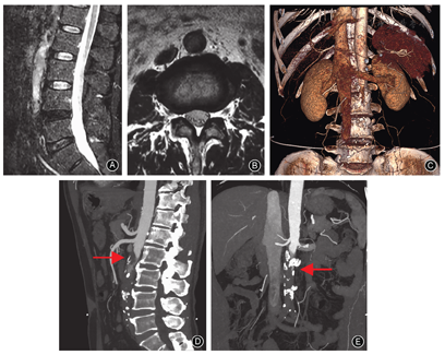 Leriche综合征是腹主动脉末段至髂动脉段,因动脉炎或动脉粥样硬化后发生钙化、溃疡、血栓形成引起纤维斑块病变,使管腔狭窄或闭锁导致远端血运不足而引起的一种罕见疾病。本文报告一例69岁男性患者曾误诊为腰椎管狭窄症,行保守治疗5年无效。再次就诊MRI显示腰椎未见明显异常,转血管外科排除血管病变。双下肢血管超声检查显示未见异常,认为症状与血管病变相关性较小,建议再次骨科就诊,以排除腰椎病变。经仔细查阅腰椎MRI后发现L2椎体水平以下腹主动脉腔内信号强度不均匀性增加,行腹主动脉CTA检查示腹主动脉及髂总动脉硬化,并肾动脉开口水平以下腹主动脉及髂总动脉管腔狭窄及闭塞,诊断为Leriche综合征。