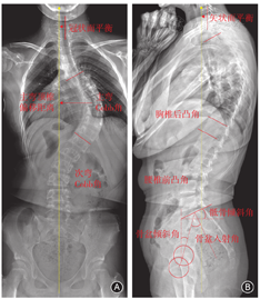 2.顶椎偏移距离(apical vertebral translation, AVT),是评估脊柱侧凸的常用指标,对制定手术策略、预测术后并发症等具有重要的指导意义。评估上胸弯和胸弯时,定义为顶椎或顶椎间盘中点至C7铅垂线的水平距离;评估胸腰弯和腰弯,定义为顶椎或顶椎间盘中点至骶骨中垂线的水平距离(图1)。
