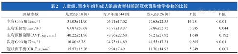 儿童组、青少年组和成人组患者脊柱畸形冠状面影像学参数的比较
