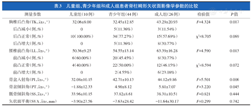 儿童组、青少年组和成人组患者脊柱畸形矢状面影像学参数的比较