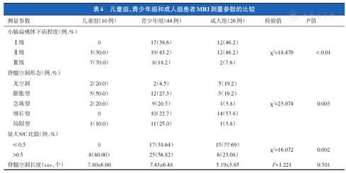 儿童组、青少年组和成人组患者小脑扁桃体下疝程度(P< 0.001,表4)、脊髓空洞形态(P=0.003,表4)和最大S/C比值(P=0.002,表4)的差异均有统计学意义。