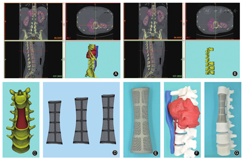 将肿瘤切除后邻近椎体半径减少1~2 mm做为3D打印人工椎体的半径;以肿瘤切除后上、下相邻椎体之间的距离(切除椎体的范围和上下相邻椎间盘的高度之和)作为人工椎体的高度;根据脊柱肿瘤位置,依据生理曲度,设计人工椎体曲度,并对人工椎体进行中部收腰设计;而后将实体人工椎体进行网格化多孔处理(孔径600~800 μm、孔隙率70%~80%),最后进行人工椎体打印。