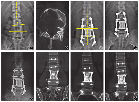 后前路联合手术4例(26.7%):先通过后正中切口显露病椎及临近椎体,而后根据需要置入螺钉,分块切除病椎后方结构,行后方固定。改为侧位,行胸腹联合切口或腹膜后斜切口显露病椎,分块切除病椎及病椎临近椎间盘,处理终板后,置入3D打印个体化人工椎体,行或不行侧前方固定。