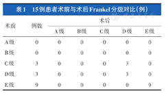 15例术前Frankel分级C级的3例术后7 d恢复到D级,D级和E级患者无明显变化,出院时的Frankel分级较术前无统计学差异(Z=-1.732,P=0.083);末次随访时,除2例死亡患者,其余患者Frankel分级较术后7 d时无明显变化(表1)。