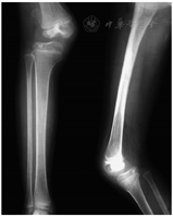 术后19年复查,下肢发育基本对称,膝关节伸屈0°-140°,无不适症状,能参加体育活动。X线片示胫骨平台平整对称,股胫角170°,髌股关节正常,骨硬化无进展(图5)。Kujala髌股关节功能评分98分,Tegner评级4级。生育一女,发育正常。