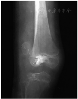 蜡泪样骨病的临床表现变异很大,从受累肢体的慢性疼痛到肢体严重畸形均可见到。疼痛是成人病例常见的症状,可能与骨膜感觉神经纤维受到骨质增生的刺激有关;而小儿病例是骨内膜增生,因此疼痛不明显[9]。软组织症状常是蜡泪样骨病的初始症状[10]。软组织挛缩始于儿童时期,多发生在单侧肢体,不断进展,甚至造成肢体严重畸形[2,4]。软组织纤维化、异位骨化和增生骨突出关节面是肢体功能障碍的主要原因[4,11,12]。患者也可长期没有症状,骨病变常在一次偶然的放射线检查中被发现[13]。常见的畸形有髋、膝关节屈曲挛缩、膝外翻、跟腱挛缩、足内翻或外翻畸形、足趾屈曲重叠等[8]。本例右膝关节严重外翻畸形和髌骨顽固性脱位是蜡泪样骨病软组织挛缩的结果,与外伤无关。