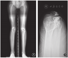 术后4个月,因胫骨内翻畸形行近端骨骺外侧阻滞术,6个月后获得矫正(图4)。术后10个月,因下肢内旋和股骨超长2 cm,行股骨下端外旋短缩截骨术,3个月后截骨愈合。