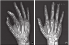 掌骨头缺血性坏死可发生在所有掌骨,最多见于中指和环指,拇指发病率最低;多数为单发病灶,多发病灶较少见[1,3]。青少年掌骨头缺血性坏死的占比较高,超过50%的病例发病年龄小于20岁[3];除少数病例有明确的类固醇应用史外,绝大多数青少年患者都有相关的创伤病史[3, 7,8,9]。掌骨头缺血性坏死的临床症状根据严重程度而表现不同,有些患者没有任何临床症状;多数患者典型的症状是掌指关节局部疼痛、掌指关节活动受限[7,10];其他症状还有关节活动异响、抓握力减弱等[2,11]。