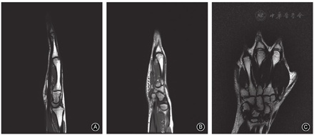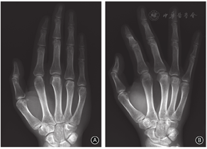 男,14岁,学生,右侧优势利手,既往体健、无风湿免疫性疾病及激素类药物使用史。5个月前因拳击伤致右手小指疼痛、肿胀、活动受限于当地就诊,余指无明显异常。X线检查提示右手小指掌骨颈骨折,断端无明显成角和移位(图1A)。予以石膏外固定保守治疗1个月,拆除石膏后开始右手功能锻炼,恢复良好。1个月前开始无明显诱因出现右手中指、环指掌指关节疼痛,活动时加重,手指不能伸直,右手抓握力降低,未行特殊治疗,症状逐渐加重后来我院就诊。