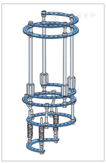 Charles Taylor于20世纪90年代中期设计了泰勒空间外固定架,除了兼顾Ilizarov外固定器的优点外,还具有极为优良的操控性。此后还陆续出现了TL-HEX、Ortho-SUV等各种不同的六轴外固定架。这些六轴外固定架由多平面的固定环和六根交错排列可独自调节长度的调节杆组成。将患者肢体的畸形数据和安装参数输入专用软件可计算出6个调节杆的调节方案。通过稳定的外固定支架和计算机提供的精确的治疗方案,可实现对外固定支架的精确调节,完成自身肢体的矫形和(或)延长。这一设计的出现大大提高了外固定支架在肢体延长和矫形方面的便捷性、科学性和精确性。但目前此种延长器仍然存在价格较高、固定刚度不易调整的缺点[9]。