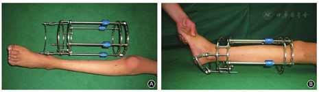 (三)肌肉挛缩与关节僵直:小腿三头肌挛缩常为胫骨延长所致,另外钢针穿通固定也是影响关节功能的另一重要因素。通过适当的功能锻炼及负重行走,可减轻挛缩,但不能完全避免。个别病例需手术松解。在小腿延长过程中,尤其是大幅度肢体延长(大于10 cm)过程中,踝关节屈曲挛缩的发生率非常高。安装跨踝关节固定的环形外固定支架,能避免发生足下垂畸形。