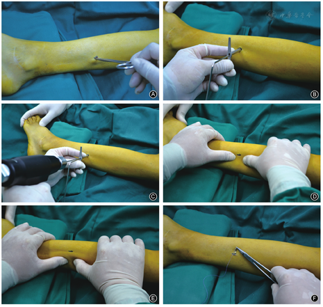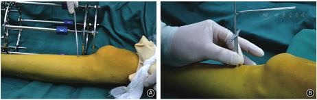 截骨平面一般为腓骨中、下1/3处,切口0.5 cm,用止血钳分开软组织达腓骨;插入微创连孔截骨器(北京骨外固定技术研究所,中国),连续钻3~4个孔,拔出截骨器,按压两端,腓骨即可折断(图3)。