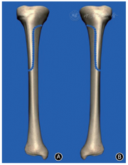 于胫骨结节下胫骨嵴内侧,根据术前预设延长长度选取长约1 cm的近、远端两个纵行切口(正常皮肤每个切口边缘上下左右皮肤延展范围约2 cm)。超过4 cm的较长距离延长时,纵行截骨皮肤延展常受限,需增加中间切口。依次切开皮肤、皮下组织及深筋膜,暴露胫骨,安装套筒,用直径2.5 mm钻头的电钻钻孔。通过胫骨近端第一个皮肤切口完成近端内侧横行和中段的纵行截骨的近侧部分,通过第二个皮肤切口完成远端外侧横行和中段纵行截骨的远侧部分。截骨线在左胫骨形如"S"、在右胫骨形如"Z",截骨长度比预期延长长度长2 cm左右(即延长结束时截骨近、远端骨质重叠2 cm)。安装外固定矫形器,穿针、固定方法同前。两端截骨线"断点"呈相反方向将骨截开,然后借助器械应用旋转手法使骨裂开。"S-Z"形截骨较横断截骨操作复杂(图5)[13],但增大了截骨断端皮质骨接触面积,有利于新骨再生和矿化,可以减少截骨处骨延迟愈合和骨不连等并发症的发生。截骨后截骨两端仍有部分重叠,可减少新生骨的应力,减少再骨折发生的风险。