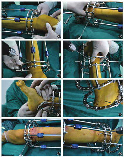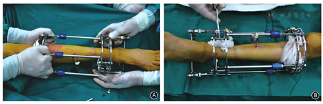 术前根据模拟数值提前预装好六轴外固定架,整体消毒后术中直接套在小腿上并作为穿针导向器,远近端各穿入一枚钢针即可将外固定架与小腿固定(图8B)。之后再打入剩余全针和半针,大大缩短安装外固定架时间。