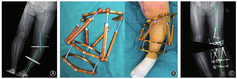 如果患肢存在短缩合并明显畸形(尤其是双平面、扭转畸形及侧向平移)可考虑使用六轴外固定架同步解决。部分六轴外固定架可以通过术前软件模拟根据畸形情况预装好匹配畸形的外架(图8A)。