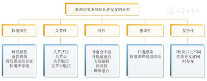 秦泗河等根据2 000多例下肢延长手术病例的经验,进一步理清了手术失误和并发症概念上的界限,提出按性质将最常见的肢体延长并发症分为软组织性、关节性、骨性、感染性和复合性五大类。软组织性并发症包括神经血管损伤,软组织性挛缩即骨与软组织未同步延长造成的髋、膝、踝的挛缩,活动受限等;骨性并发症则包括成骨不良,力线不良及过早愈合等;关节性并发症主要包括关节挤压和关节脱位等严重并发症,此种多会遗留后遗症,故单独列出;感染性并发症包括常见的针道感染以及蜂窝组织炎等;如涉及2种以上并发症者则视为复合性(图1)。这种分类方法能体现不同类型的性质特点,反应出层层递进的关系,便于记录、区分、强调和规避。