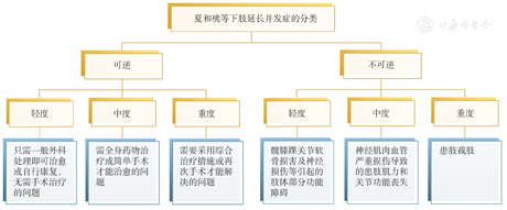 不可逆并发症指在治疗后肢体仍遗留功能障碍或残缺等后遗症,患肢坏死甚至截肢,也分为轻度、中度和重度。轻度指髋、膝、踝关节软骨损害,骨关节炎以及神经损伤等引起的肢体部分功能障碍;中度包括神经、肌肉、血管严重损伤导致的患肢肌力和关节功能丧失;重度即发生患肢截肢,如主要血管损伤引起的肢体坏死,以及严重小腿骨筋膜室综合症引起的肢体广泛软组织坏死等。
