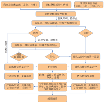 脊柱感染性疾病(infectious diseases of spine, IDS)是指由不同病原微生物引起的脊柱不同部位(椎体、椎间盘、附件、椎管和邻近椎旁组织)的一系列感染性疾病,约占全身骨骼肌肉系统感染的2%~7%。IDS经典分类法可分为特异性感染和非特异性感染两种类型。IDS往往起病隐匿,临床表现不典型,影像学及实验室检查缺乏特异性,对每种疾病的准确诊断及治疗造成很大困扰,常导致漏诊、误诊,甚至是误治。目前临床诊疗程序混乱、治疗方法多样、用药及疗程不规范等问题仍影响着IDS的预后。就目前IDS的诊断和治疗流程的研究进展进行探讨,以期能够进一步规范IDS的诊疗流程。