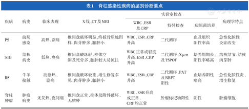 | 脊柱肿瘤 | 肿瘤病史 | 无发热、夜间痛 | 椎间盘正常、椎体及附件破坏、无脓肿 | WBC、ESR升高或正常,CRP均正常 | 肿瘤标记物阳性 | 阴性 | 肿瘤细胞 |
