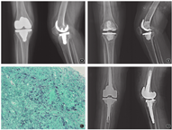 入院检查:跛行步态,右膝关节轻度红肿,前正中纵向15 cm手术切口愈合良好,切口远端下方可见0.5 cm×0.5 cm窦道,有少量浑浊、淡黄色液体渗出。关节皮肤温度较对侧略升高,关节屈伸活动度0°-30°。右下肢感觉、运动、反射均正常。X线片未见假体明确松动,位置良好(图1A)。实验室检查:红细胞沉降率为12 mm/1 h,C反应蛋白为1.06 mg/L,降钙素原<0.02 ng/ml;G试验、GM试验、冷凝集试验均阴性;结核感染T细胞检测:ESAT-6为14,CFP-10为4。关节穿刺获得5 ml浓稠血性关节液,细菌培养为阴性。