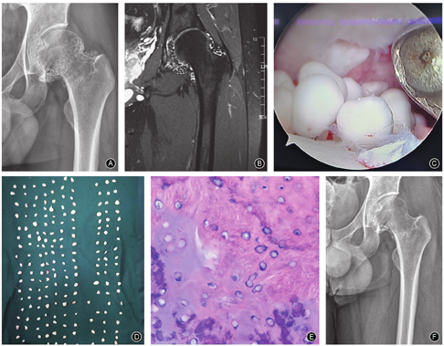 患者在全身麻醉下行关节镜下左髋关节滑囊探查清理术。患者平卧于牵引床上,于大转子前缘及上缘交点做1 cm纵行切口,建立前外及前中入路。使用射频切开关节囊,可见滑膜轻度增生,髋关节外周室内有大量游离体。再于"C"型臂X线机透视下牵引患侧至髋关节脱位,术中见髋臼、股骨头软骨磨损退变,髋臼圆韧带处滑膜增生并伴有软骨变性,少量悬垂体(有蒂与滑膜相连的软骨结节)、髋关节中央室内大量游离体(脱离滑膜,游离于关节腔内的软骨结节)呈"石榴籽"样(图1C),符合滑膜软骨瘤病Milgram Ⅱ期[2]表现。对小游离体采用刨刀进行清理,对较大的游离体应用髓核钳咬除。取出游离体约200余枚(图1D),清理增生滑膜及变性软骨,对损伤软骨给予修整成形。取数枚游离体送病理检查,结果示游离体核心由环簇状软骨细胞结节组成,结节间有纤维结缔组织间隔(图1E),符合滑膜软骨瘤的游离体表现。