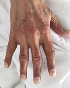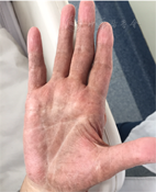 体格检查:体温36.9℃脉搏62次/min,呼吸20次/min,血压95/64 mmHg(1 mmHg=0.133 kPa),神志清楚,精神可,营养不佳,头发稀少,双手及双足掌侧皮肤可见不均匀色素沉着(图1),指甲远端变白,与甲床分离(图2)。全身浅表淋巴结未触及肿大。甲状腺不肿大。心、肺未见异常。腹部无压痛、反跳痛,肝、脾未触及,移动性浊音阴性,肠鸣音正常。双下肢轻度可凹性水肿。