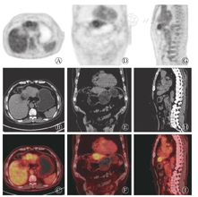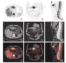 本文病例中,两种显像剂对同一病灶的显示差异显著,也充分体现了不同显像剂的联合使用对肝脏不典型性或非特异性病变的初期诊断具有重要价值。因此,临床监测肿瘤或对肿瘤疗效进行评价时,要考虑肝脏肿瘤的不同类型及特征;同时在条件允许的情况下,最好能够多种辅助检查同时进行并综合分析,这样能够明显提高检测的灵敏度和特异度,为临床的诊断及治疗提供一定的价值。