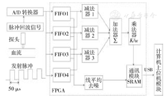 在系统的设计实现过程中,血流信号的提取是关键,该部分主要在FPGA主控板中完成。在系统实现过程中,兼顾探头工艺、硬件实现和图像帧频的情况下,在每条扫描线上发射EP1、EP2、EP3及EP4共4条发射脉冲,时间间隔T=50 μs,将得到的4个脉冲回波信号,存于先进先出(first in first out,FIFO)缓存器中,通过式(9)得到血流信号,之后通过通讯模块经USB接口上传到计算机上位机模块;同时,FIFO中的脉冲回波信号经线平均降噪法后存入SRAM[13],然后通过USB接口上传到计算机上位机模块,以用于组织结构成像。(图2)