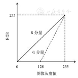 为提高血流的可视化,并增强对图像中细微变化的分辨力,可使用灰度分层法对得到的血流图像进行伪彩编码。灰阶图像是对反射回波的直接显示,根据灰阶血流的成像原理,血流的亮度与血流速度有一定的关系,即在一定范围内血流速度越快,则图像的亮度就增高。因此,为了区分血流图像的亮度差别,当血流亮度达到一定范围之后,在红色的基础上,出现黄色。将灰度图像对应到红(R)、绿(G)、蓝(B) 3个通道上,灰度值与3个通道的映射关系如图3所示。