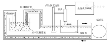 实验平台包含:由可控流速的蠕动泵、医用硅胶管、玉米淀粉悬液构成的模拟血液循环系统,中心频率为20 MHz的线性扫描探头,由下位机采集电路和计算机上位机模块构成的血流成像系统(图5)。使用蠕动泵控制模拟血液流速,用探头对模拟血管成像。