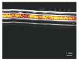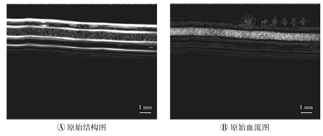 为了更好地观察血流的状态,将伪彩增强后的血流与原结构图叠加,将血管和血管壁及血管周围组织同时显示。如图8所示,血流边缘清晰,直观,便于观察。