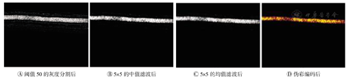 为了提取更加清晰的血管,对图7A中的图像进行最佳阈值为5×5的中值滤波,以滤除血流周围的噪声,得到图7B;然后为了得到相对均匀的血流图像,进行均值滤波以对图像进行平滑,得到图7C,此时,血管周围伪像基本完全滤除;为了便于观察,对血流进行伪彩增强,如图7D所示,得到了清晰的伪彩血流图。图像颜色越趋于黄色,表明血流图像中图像的亮度越亮。