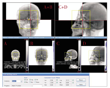 (一)鼻咽癌患者1例,男,72岁,将10 cm×10 cm的射野区域设为ROI,0°DRR图与0°X射线影像匹配,90°DRR图与90°X射线影像匹配,主要观察两幅重叠影像的骨型标志是否吻合,如0°时下颌骨、硬腭、鼻中隔、眼眶、乳突等;90°时下颌骨、硬腭、颅底线、颈椎、舌骨等。进行自动或手动分析匹配后的各个方向的误差如图1左下角蓝框所示,患者Lat方向即X(左右)方向为0.08 cm;Lng方向即Y(头脚)方向为-0.11 cm;Vrt方向即Z(前后)方向为-0.04 cm;Rtn即旋转角度为0.09°。因患者身体旋转而造成的剂量改变很小可以忽略[3,4]。(图1)