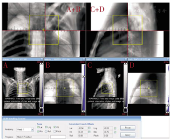 (二)肺癌患者1例,男,61岁,匹配方法同上,参考的骨性标志如0°时胸椎、椎体棘突、肋骨、锁骨等;90°时胸椎、椎体前缘、椎间隙、胸骨等。进行自动或手动分析匹配后的各个方向的误差如图2左下角蓝框所示,患者Lat方向即X(左右)方向为-0.04 cm;Lng方向即Y(头脚)方向为-0.03 cm;Vrt方向即Z(前后)方向为0.24 cm;Rtn即旋转角度为-0.75°。(图2)