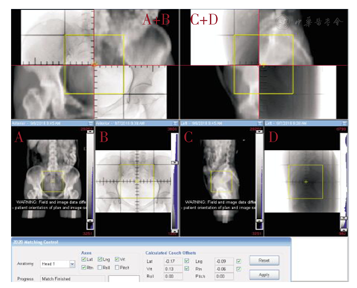 (三)宫颈癌患者1例,女,54岁,匹配方法同上,参考的骨性标志如0°时骶骨、髂骨、耻骨联合、坐骨结节、股骨头等;90°时腰椎、骶骨、耻骨联合、股骨头等。进行自动或手动分析匹配后的各个方向的误差如图3左下角蓝框所示,患者Lat方向即X(左右)方向为-0.17 cm;Lng方向即Y(头脚)方向为-0.09 cm;Vrt方向即Z(前后)方向为0.13 cm;Rtn即旋转角度为-0.06°。(图3)