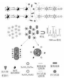 上转换发光(up-converting phosphor, UCP)材料是由稀土元素构成的发光晶体材料。稀土元素所具有的f电子层赋予UCP材料独特的上转换发光特性,即可被低能的红外光激发并发射高能的可见光[6]。近年来,通过对UCP纳米颗粒进行表面修饰,将其与生物分子连接并进行标记的技术得到广泛应用。修饰后的UCP钠米颗粒作为生物示踪物可完全排除生物背景荧光干扰,在检测中具有高度的敏感性、特异性与稳定性。因此,该技术在高通量药物筛选与输送、基因组学研究、光动力学治疗、组织成像、食品环境检测以及生物战剂防御等方面具有潜在应用价值[7]。