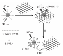 如图3所示,Li等[20]将上转换纳米颗粒标记的适配体通过π-π键作用吸附于石墨烯表面,产生上转换颗粒荧光猝灭。加入待检测物时,适配体发生构象改变,脱离石墨烯表面,上转换颗粒荧光恢复。基于该原理构建了基于适配体的荧光共振能量转移传感器,可特异性检测卡那霉素。检测范围0.03~3 nmol/L,检出限为18 pmol/L。Zhang等[21]建立了待检测物与互补链竞争结合适配体的荧光共振能量转移传感器。互补链标记绿色荧光染料,上转换颗粒标记适配体,上转换颗粒在477 nm处的发射光会被荧光染料吸收,在530 nm处出现荧光增强,加入待检测物后,上转换颗粒荧光恢复。该传感器检测范围0.1~10 ng/ml,检出限为0.054 ng/ml。