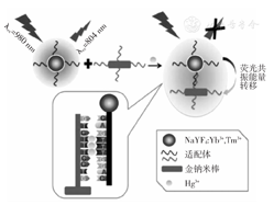 重金属是指密度>5 g/cm3的金属,约有45种,如:汞、铜、铅、镉、铁、锌、锰、钙、铬等。从食品安全方面考虑,最需关注的是汞、镉、铅、铬,以及类金属砷等物质。工业排放大量重金属物质污染水、空气、土壤,造成严重的环境污染[31,32,33]。这些物质会在农作物、水产品和其他食品中富集,通过食物链进入人体,引起急性或慢性的食品中毒,危害健康。近些年发展了一些快速重金属检测方法,如:酶分析法、试纸法、免疫分析法等,但与传统的检测方法相比,这类检测方法只能对被检物进行定性或半定量检测,且灵敏度和准确性较低[34,35,36]。急需用于食品中重金属快速检测的新技术。如图6所示,Chen等[37]合成了980 nm激发、804 nm发射的掺杂Tm3+的上转换纳米颗粒及在806 nm处有吸收峰的金纳米棒;将Hg2+的适配体修饰氨基,互补链修饰巯基,分别标记到上转称钠米颗粒和金钠米棒上;形成T-Hg2+-T结构促使2种颗粒距离拉近,引起荧光猝灭。基于以上原理构建了荧光共振能量转移适配体传感器,可检测饮用水、湖水及血样中的Hg2+残留,检测范围5~100 nmol/L,检出限为2 nmol/L。利用相同原理,Wu等[38]建立了可同时检测鱼、虾中的Hg2+、Pb2+重金属残留的适配体共振能量转移传感器,检测范围分别为0.5~500 nmol/L、0.1~100 nmol/L,检测灵敏度高,检测范围较宽。