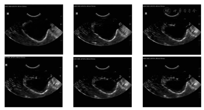 穿刺变形实验采用DP-50全数字便携式超声诊断系统观测盆腔器官群在穿刺实验中的变形情况。实验过程中将超声探头垂直于进针方向由夹具加持在骨盆耻骨联合下方,扫描面为穿刺针与超声探头构成的平面。穿刺过程中的超声影像如图10所示。从图中可清晰观察到穿刺针的进针深度以及前列腺体的变形情况。实验结果证明,盆腔器官群实体模型在超声导航穿刺实验中能够获得较好的图像反馈效果。