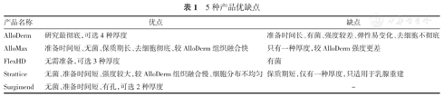 自1994年美国LifeCell公司推出第一款源自人类真皮组织ADM产品的AlloDerm以来,有不同公司源自于人、猪、牛真皮组织的ADM产品相继问世并应用于临床,如AlloMax(Davol Inc., Murray Hill, NJ), FlexHD(Ethicon Inc., Somerville, NJ), Strattice(LifeCell Corp., Branchburg, NJ), Surgimend PRS (TEI Biosciences Inc., Boston, MA)[10]等。虽然制造商努力去除所有细胞及抗原成分,仅保留原有的细胞外基质(extracellular matrixc,ECM),但不同公司的产品在强度、厚度等方面具有不同差异。Carruthers等[11]研究结果表明,与虽然AlloMax与AlloDerm两种产品均来自人类尸体皮肤,但其生化成分不完全一致,可能引起不同的宿主抗移植物反应;前者含有更多的可溶性蛋白,去细胞化更彻底。Sandor等[12]研究结果发现,AlloMax强度较AlloDerm差。上述几种产品的优缺点见表1[10]。