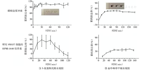 ALA和HMME水凝胶如图2插入部分所示。ALA水凝胶在PBS中全部释放出ALA仅需10 min;在孵有SW837细胞的RPMI-1640培养基中需30 min,且累积溶出率从60 min开始下降,表明释放出的ALA很快被细胞吸收。相比之下,HMME水凝胶在PBS和培养基中的释放速率均低于ALA水凝胶,但其在15 min时也开始释放。在PBS中,2 h时累积溶出率下降,8 h后仅有50%的HMME从水凝胶中释放出来;在RPMI-1640培养基中,HMME的累积溶出率保持在36.8%,表明在HMME的释放和细胞摄取之间存在动态平衡。(图2)