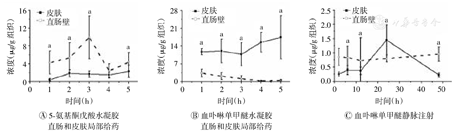 笔者首先比较了直肠和皮肤局部给药后直肠壁和皮肤对ALA和HMME的吸收情况,即将ALA水凝胶和HMME水凝胶分别通过直肠和皮肤局部给药,并于给药后的不同时间点测量直肠壁和皮肤中的光敏剂浓度。结果显示,直肠壁对ALA的吸收远高于皮肤。给药后1 h和3 h时,直肠壁中的PpⅨ浓度分别是皮肤的9.76倍和5.80倍,差异均具有统计学意义(均P<0.05)(图3A)。3 h时,直肠壁对ALA的吸收达到最大,随后减小;而皮肤中的ALA浓度在给药后5 h时仍在增加。上述结果表明,以水凝胶栓剂形式给药时,与皮肤相比,ALA能迅速在直肠壁积聚并达到最大浓度。相反,只有极少量的HMME被直肠壁吸收,且随着时间延长,浓度持续稳定下降;而皮肤中的HMME浓度始终维持在相对较高水平(图3B)。其原因可能是由于真皮对高相对分子质量的HMME不易吸收,导致HMME有可能在皮肤中潴留,而通过直肠局部给药的HMME更倾向于被直肠黏膜分泌液清除。同时,笔者也检测了静脉注射给药后直肠壁和皮肤对HMME的吸收情况,结果发现,直肠壁中的HMME浓度高于皮肤,但24 h时皮肤中的HMME浓度急剧增加(图3C)。上述结果表明,与水凝胶栓剂局部给药相比,静脉注射给药后直肠壁对HMME的吸收效果更好。