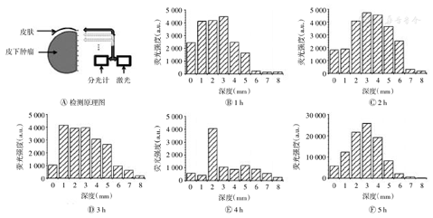 光敏剂在目标肿瘤中的分布和浓度对PDT有重要影响。局部给药时,光敏剂的穿透深度直接影响着PDT的疗效;但由于PpⅨ的荧光信号微弱及其在深部组织中的穿透深度有限,故很难进行在体测量[26]。笔者检测了新鲜肿瘤组织垂直剖面的PpⅨ荧光强度。在ALA水凝胶皮肤局部给药后的不同时间点,切取肿瘤组织,将肿瘤组织均分为两部分,一部分置于样品架上,垂直剖面用分光计扫描,测量间隔为1 mm。ALA水凝胶皮肤局部给药后ALA的穿透深度为3~6 mm,且具有时间依赖性。给药后1 h,穿透深度为3 mm;给药后2 h,穿透深度达6 mm;给药后4 h,其所有深度(除2 mm处)的荧光强度均很弱,其原因可能是扫描路径中有血管存在,而血管中的血红蛋白会显著影响荧光信号。(图6)
