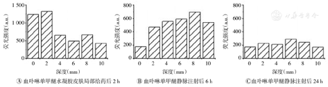 如前所述,HMME水凝胶皮肤局部给药后,皮下肿瘤中只有极少量的HMME(图4B)。为进一步证实此结果,笔者检测了HMME在肿瘤组织中的分布。结果表明,HMME水凝胶皮肤局部给药后,只有在皮下深度达2 mm时,才能检测到实质性的荧光信号(图7A),这与笔者之前的研究结果相一致。同时,笔者还测量了静脉注射后HMME在皮下肿瘤中的分布。因前期实验中HMME静脉注射后,皮下肿瘤和皮肤对HMME的吸收达峰值的时间点分别为给药物后6 h和24 h(图4D),故笔者分别测量了给药后6 h和24 h时HMME在肿瘤组织中的分布。结果显示,这2个时间点HMME在肿瘤组织中的分布相一致,尽管6 h时HMME的荧光强度显著较高(图7B、图7C),但并未观察到皮肤中的HMME水平在24 h时有所增加(图4D),其原因可能是由于皮肤太薄,以致检测系统不能准确接收荧光信号。