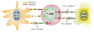 2015年发布的《世界癌症报告》指出:2012年全球癌症患者新增病例1 410万,死亡病例820万,其中,中国新增癌症患者307万例,并有约220万例患者死亡,分别占全球新增病例、死亡病例总数的21.9%和26.8%。且该报告预测全球癌症病例将呈现迅猛增长态势,至2025年将递增1 900万例以上,其中非洲、亚洲和中南美洲的发展中国家癌症发病形势最为严峻[1]。目前,肿瘤治疗除手术、放射治疗(放疗)和化学药物治疗(化疗)3大常规治疗方式外,还有中医中药治疗、分子靶向治疗等新型治疗手段。尽管近年来各种治疗手段均取得了一定的进展,在一定程度上提高了肿瘤患者的总生存率,但晚期肿瘤患者的预后、远期生存率和生活质量均有待提高。上述治疗方法均为针对肿瘤细胞进行的。近年兴起的肿瘤免疫治疗与以往的治疗策略不同,该方法针对的靶标不是肿瘤细胞和组织,而是人体自身的免疫系统。该疗法旨在调节和激活人体免疫系统,依靠自身免疫机能清除机体内的所有肿瘤细胞,包括转移至远处的肿瘤细胞。目前肿瘤免疫治疗的方式多种多样,其中应用免疫检查点(immune checkpoint)抑制剂阻断免疫抑制通路,进而解除机体的免疫耐受状态,重新激活机体的免疫系统,增强对肿瘤细胞的识别与清除能力从而杀灭肿瘤细胞是一个行之有效的治疗手段。本文主要从肿瘤的发生机制、免疫检查点抑制剂的作用机制与目前的治疗现状进行综述。