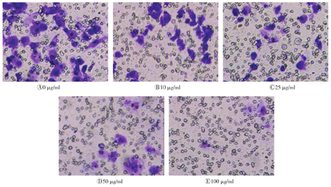 CGA处理HT-29细胞48 h后,观察结晶紫染色图片。结果显示,与对照组相比,不同质量浓度的CGA对HT-29细胞迁移具有明显的抑制作用,其差异具有统计学意义(均P<0.05),且呈现剂量依赖趋势。(图3)