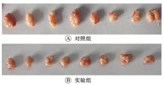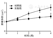 HT-29细胞荷瘤小鼠处死后,发现实验组小鼠(注射CGA)无转移瘤出现,对照组(注射生理盐水)中发现有5例肝、肺、结肠微小转移瘤。通过在不同时间点测量荷瘤小鼠肿瘤体积,得到肿瘤生长曲线(图4、图5)。结果表明,注射CGA 4周后实验组肿瘤体积明显小于对照组,其差异具有统计学意义(P<0.05);实验组肿瘤质量(0.47±0.051)g明显小于对照组(0.73±0.064)g,其差异具有统计学意义(t=8.655,P<0.05)。以上结果表明,CGA能够抑制裸鼠肿瘤的生长。