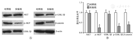 Western Blot结果显示,实验组和对照组裸鼠肿瘤中AKT、GSK-3β表达差异无统计学意义(均P>0.05),但实验组磷酸化蛋白p-AKT、p-GSK-3β和β-catenin明显低于对照组,差异具有统计学意义(均P<0.01)。(图6)