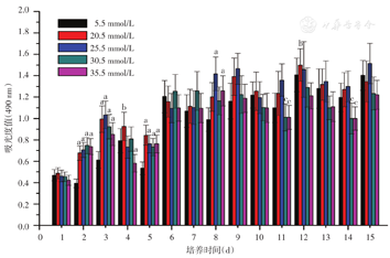 与对照组相比,20.5 mmol/L组和30.5 mmol/L组第2、3、5天的A值升高,差异均具有统计学意义(均P<0.05);25.5 mmol/L组第2、3、5、8天的A值升高,差异均具有统计学意义(均P<0.05);35.5 mmol/L组第2、3、5、8天的A值升高,第4天的A值降低,差异均具有统计学意义(均P<0.05)。将20.5 mmol/L组、25.5 mmol/L组、30.5 mmol/L组和35.5 mmol/L组进一步两两比较,结果显示:35.5 mmol/L组第4、12天的A值低于20.5 mmol/L组,差异均具有统计学意义(均P<0.05);30.5 mmol/L组和35.5 mmol/L组第11、14天的A值低于25.5 mmol/L组,差异均具有统计学意义(均P<0.05)。
