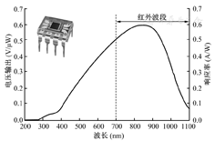 OPT101是一种集成型光电二极管,在其芯片上集成了光电二极管和跨阻放大器。该放大器可使用单电源或双电源运行,并可使用电池驱动。这种集成化设计可以有效地降低电流泄漏与噪声,并减少杂散电容引起的增益峰化。在光电导模式下,OPT101集成的8.1×10-3平方英寸的光电二极管可提供相当高的线性度和非常低的暗电流。OPT101的工作电压范围为2.7~36 V,静态电流仅为120 μA。在外部反馈电阻为5 MΩ、电容为10 pF时,OPT101的带宽为2.5 kHz,直流增益和实际工作电压分别为6×106 V/A和5 V。根据OPT101的特殊响应曲线,其在735、805和850 nm波长处的响应峰值接近86%,高于SiPMs传感器(~5%)和APDs传感器(~80%),保证了在这些波长下的高灵敏度监测。(图1、表1)